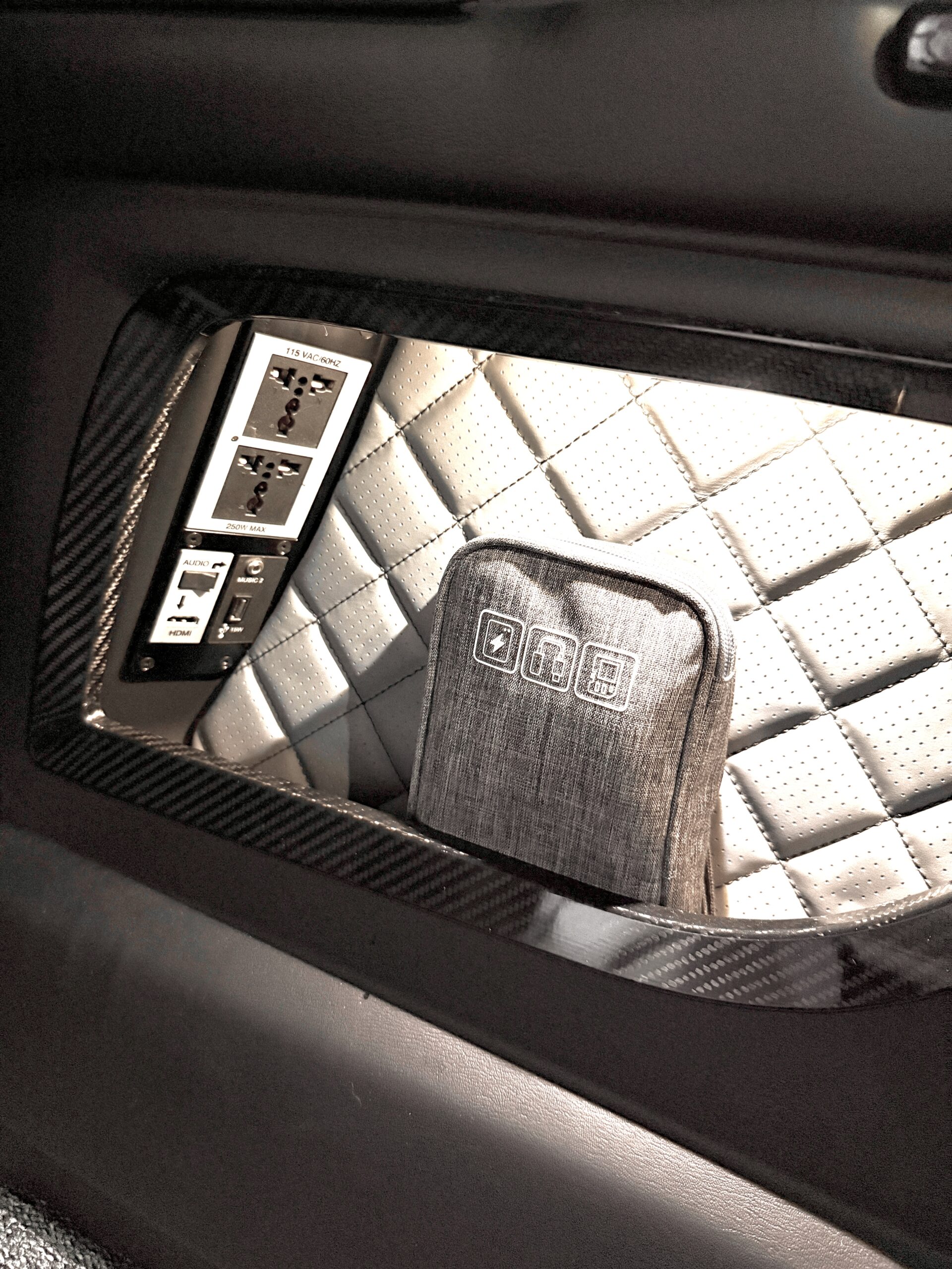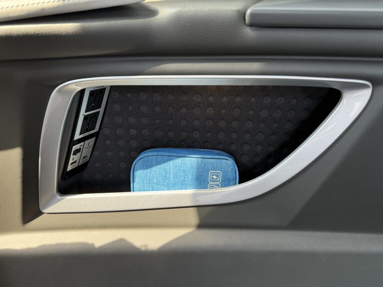 1. Storage – The compact zippered case fits neatly inside the pocket next to the in-flight entertainment (IFE) panel when not in use.